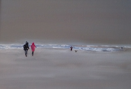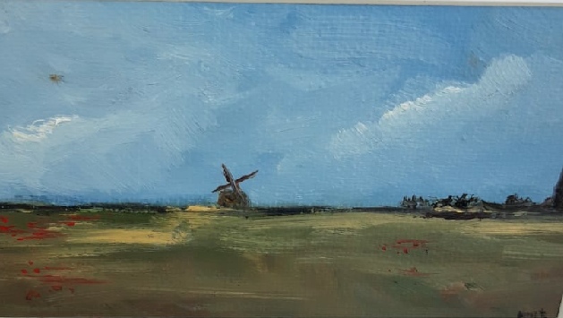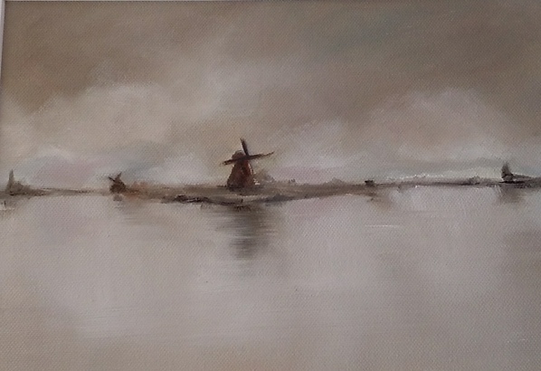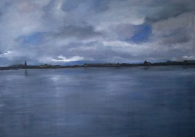 In haar landschap schilderijen is vooral veel ruimte blauwgrijs, als licht en als kleur, waardoor haar schilderijen een boeiend karakter krijgen